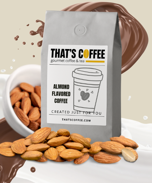 A bag of Gourmet Almond Flavored Coffee Beans labeled "THAT'S COFFEE," featuring almonds and a coffee cup, is surrounded by dynamic splashes of coffee and milk.Gourmet Almond Flavored Coffee Beans